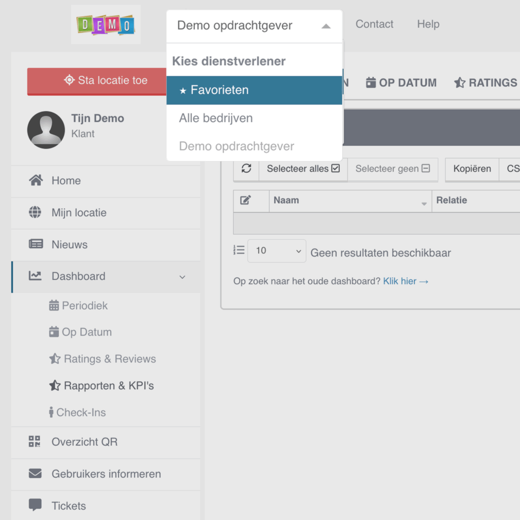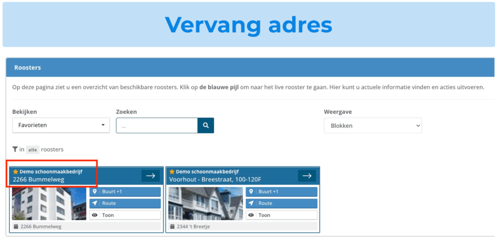 (Sla deze stap over wanneer u dit balkje niet ziet) Selecteer hier ‘Alle bedrijven’ of één specifieke schoonmaak partner. U ziet dan alleen de complexen die u hebt geselecteerd