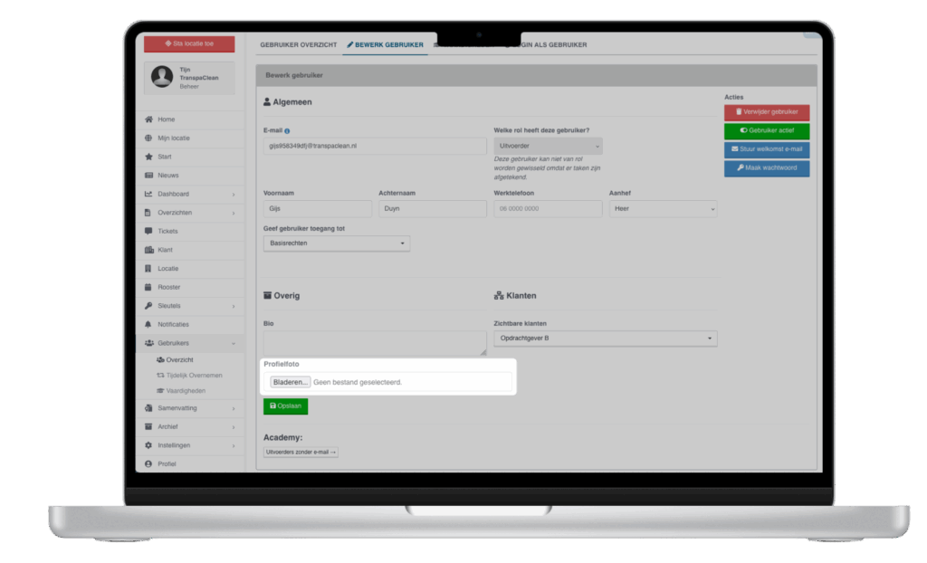 Vul vervolgens de gegevens van de uitvoerder in en klik op de groene knop + Gebruiker toevoegen. Je komt nu in het bewerkscherm, hier kun je later een welkomst e-mail sturen of een wachtwoord aanmaken voor de uitvoerder.