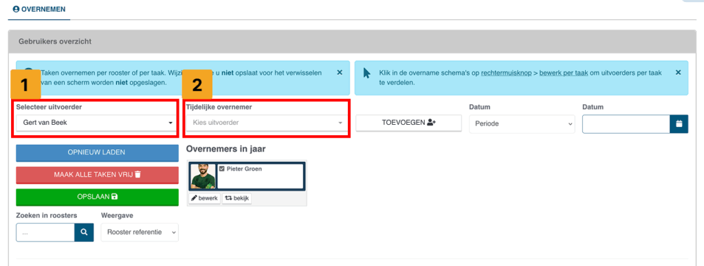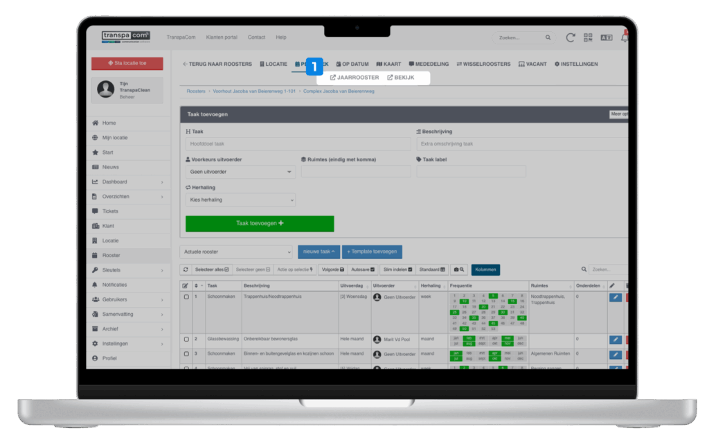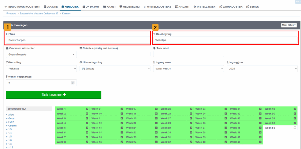 Wanneer je op de knop ‘Periodiek’ hebt geklikt of net een nieuw rooster hebt aangemaakt, verschijnt de optie ‘Taak toevoegen’. Bij het toevoegen van een taak kun je direct een uitvoerder koppelen door te klikken op ‘Voorkeurs uitvoerder’ (zie screenshot punt 1).