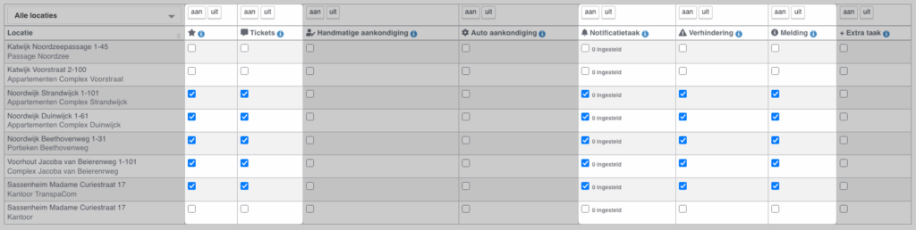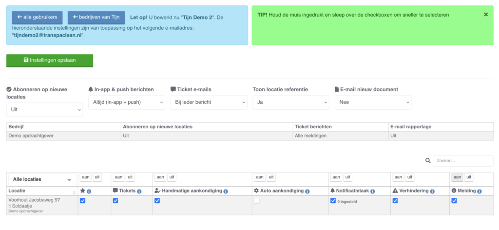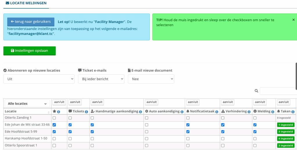 Markeer de boxjes van de locaties en soort notificaties die je wilt instellen. Klik op (i) voor meer info over de notificatie, of klik hier voor uitgebreide uitleg. Zie hieronder een screenshot van de meest gebruikte e-mail notificatie instellingen voor klant gebruikers:
