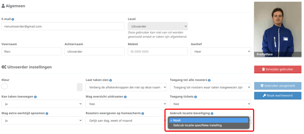 Ga naar de pagina ‘Gebruikers’ en bewerk de betreffende medewerker die als vaste uitvoerder werkt.
