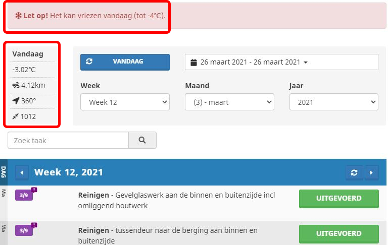In de app ziet de uitvoerder boven het rooster een weerswaarschuwing. Dit helpt om rekening te houden met omstandigheden die het schoonmaakwerk kunnen beïnvloeden, zoals vorst of regen.