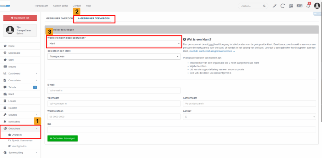 Een klantgebruiker heeft toegang tot alle locaties van de gekoppelde klant. Dit account is bedoeld voor iemand die voor de klant werkt of in diens belang handelt. De klant moet eerst aangemaakt worden voordat een gebruiker gekoppeld kan worden.