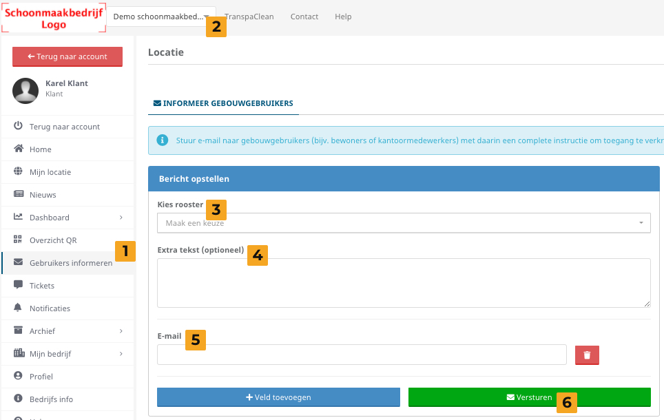 (Voor 'Beheer' gebruikersrol gaat u in uw navigatiescherm naar ‘Locatie‘ en boven de tabel naar ‘Informeer gebouwgebruikers‘, of klik hier)