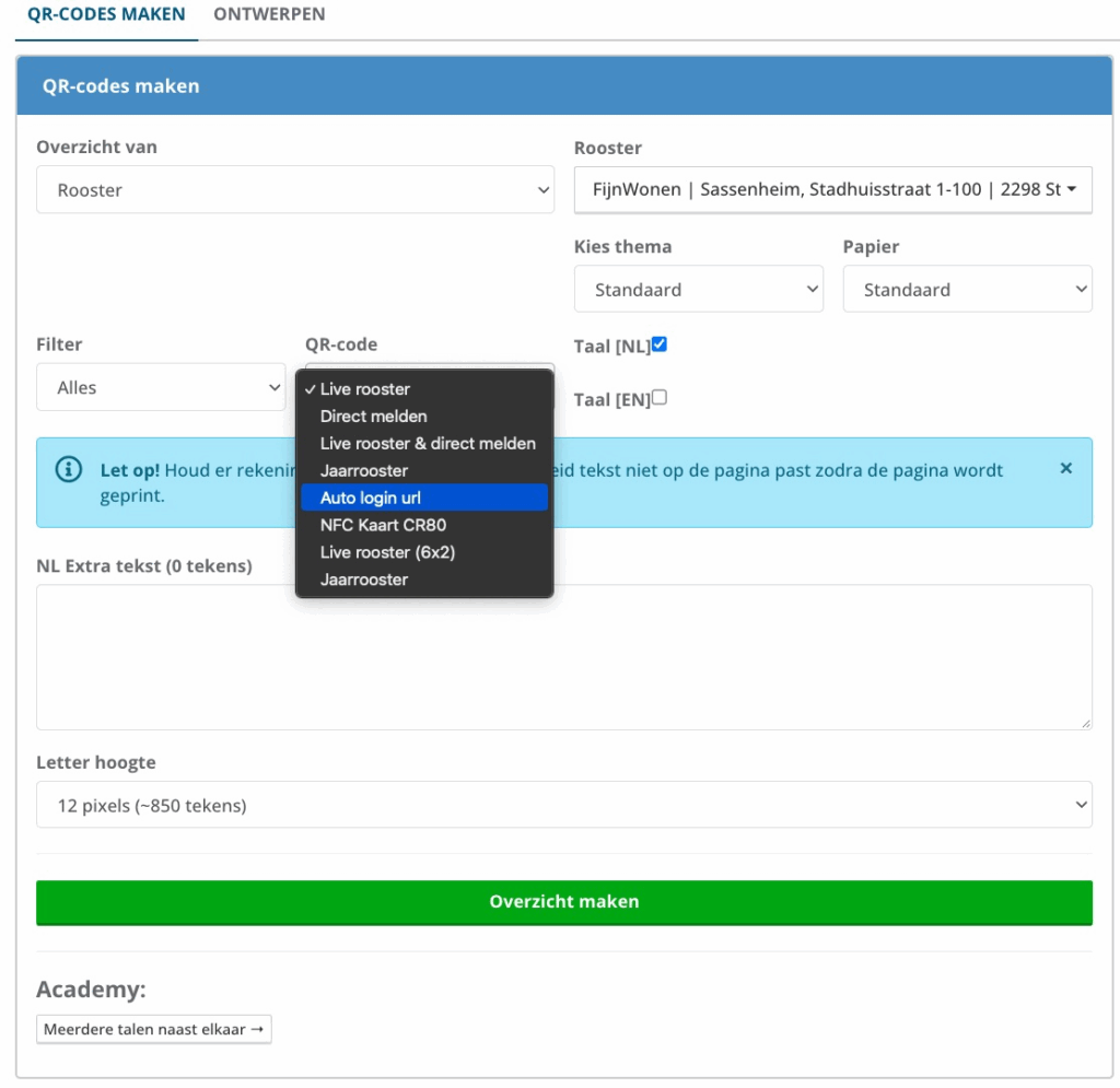 Let op! de qr-code aanmaken functie werkt het beste in Google Chrome.