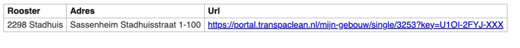 Verder hoef je aan de instellingen op standaard laten staan, zoals boven is afgebeeld. Kies zelf alleen nog de roosters/locaties of in één keer alle complexen van de aannemer op opdrachtgever. Staan de instellingen goed dan klik je op ‘Overzicht maken’ om een lijst te genereren met alle toegangslinkjes (Zie onderstaande voorbeeld).