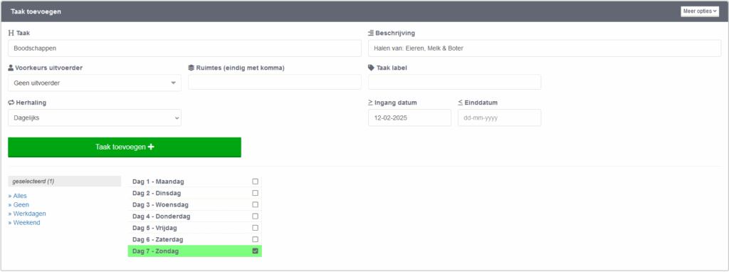 Hier vind je de informatie over hoe je een taak moet toevoegen, dit kunnen dagtaken, weektaken of maandtaken zijn.