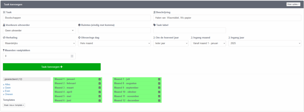 Bovenstaande voorbeeld is de optie rechtsboven ‘Meer opties‘ aangeklikt voor meer taak instelling mogelijkheden (Deze is meestal al automatisch uitgeklapt). Voor een glasbewassing taak is het bijvoorbeeld handig om ‘Stuur e-mail notificatie’ op ‘Ja’ te zetten. Zo krijgen alle betrokkenen automatisch een e-mail herinnering dat de taak binnenkort weer aan de beurt is.