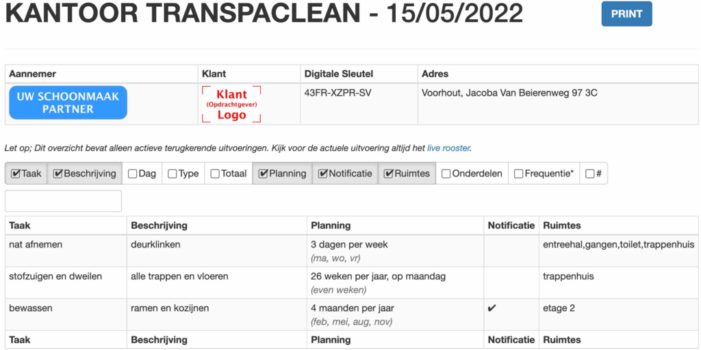 Het werkprogramma bestaat uit alle vaste werkzaamheden die uitvoerders op een locatie uitvoeren. Deze taken worden ingevoerd in het online rooster, dat het papieren of Excel-rooster vervangt. Uitvoerders melden taken hierin af, terwijl klanten live kunnen meekijken – volledig transparant. Het rooster is ook te printen, inclusief QR-code die toegang geeft tot de actuele versie.