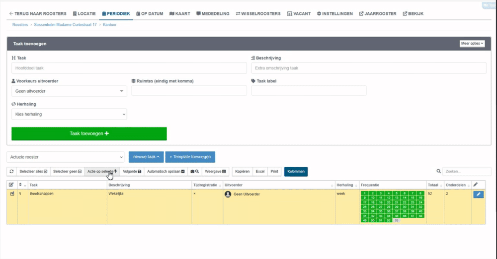 Zodra je het rooster hebt aangemaakt, kun je taken (werkzaamheden) toevoegen. Geef elke taak een duidelijke naam en beschrijving die aansluiten bij de uit te voeren werkzaamheden.