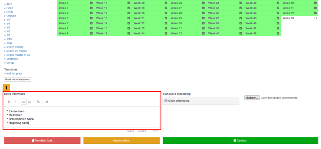 Voeg niet te veel losse werkzaamheden toe als aparte taken. Combineer dagelijkse of wekelijkse handelingen liever tot overzichtelijke taakpakketten, bestaande uit onderdelen of bulletpoints. Zo blijft je online rooster overzichtelijk en efficiënt. Meer hierover vind je bij stap 3 van dit artikel.
