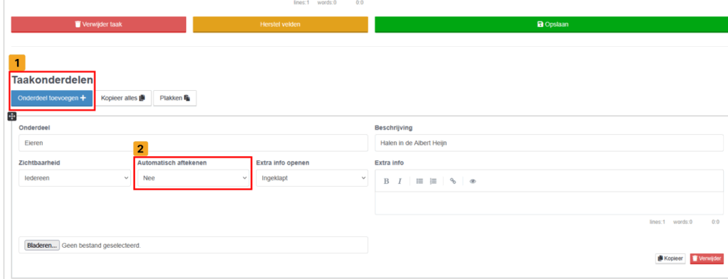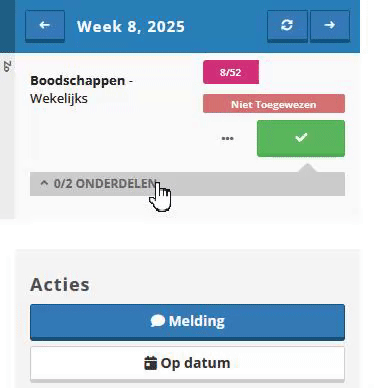 Met taakonderdelen kun je een taak opdelen in kleinere stappen. Dit zorgt voor meer structuur en biedt de uitvoerder de mogelijkheid om per onderdeel een opmerking of foto toe te voegen. Vul per onderdeel de benodigde informatie in en kies indien gewenst voor automatisch aftekenen.