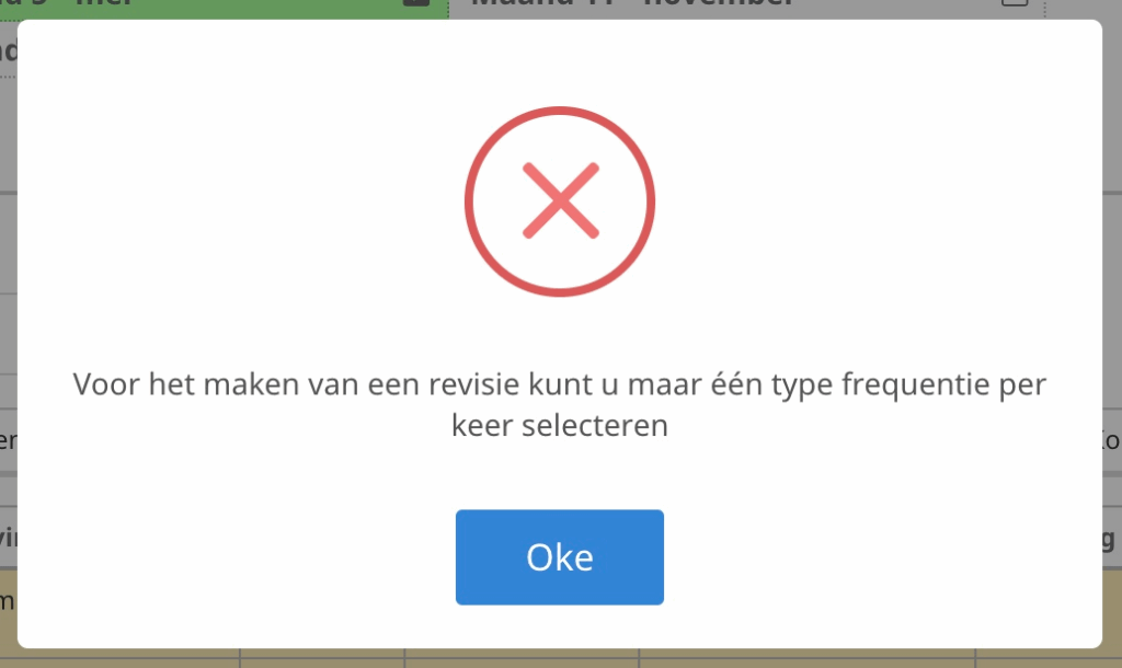 Krijgt u onderstaande melding? Dit komt omdat de door u geselecteerde taken al eens zijn afgetekend en u heeft aangegeven dat u deze geschiedenis wilt bewaren. Het is niet mogelijk om revisies te maken van een groepsselectie die bestaat uit taken met verschillende herhalingen. U kunt de stap vanaf ‘Actie op selectie‘ opnieuw doorlopen en bij geschiedenis bewaren ‘Nee‘ kiezen. Wanneer u wel de geschiedenis wilt bewaren dient u opnieuw rijen te selecteren van taken met dezelfde herhaling. De verschillende herhalingen zijn ‘dag’ ‘week’ en ‘maand’ en kunt u terugvinden in de kolom ‘Herhaling‘. Meer weten over taakrevisies?