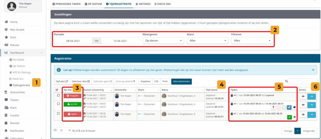 Een overzicht van alle uitgevoerde taken met tijdregistratie kunt u vinden via ‘Dashboard‘ en ‘Tijdregistratie‘, of klik hier. Zie hieronder de punten met uitleg over meest belangrijke onderdelen van dit dashboard. Let op, voor toegang tot dit dashboard heeft u een gebruikersrol 'Beheer' nodig.