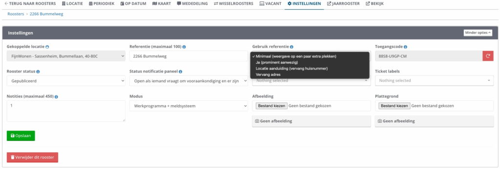 Via het veld Referentie geef je het rooster een herkenbare naam, bijvoorbeeld een complexnummer in combinatie met de roepnaam van het gebouw.