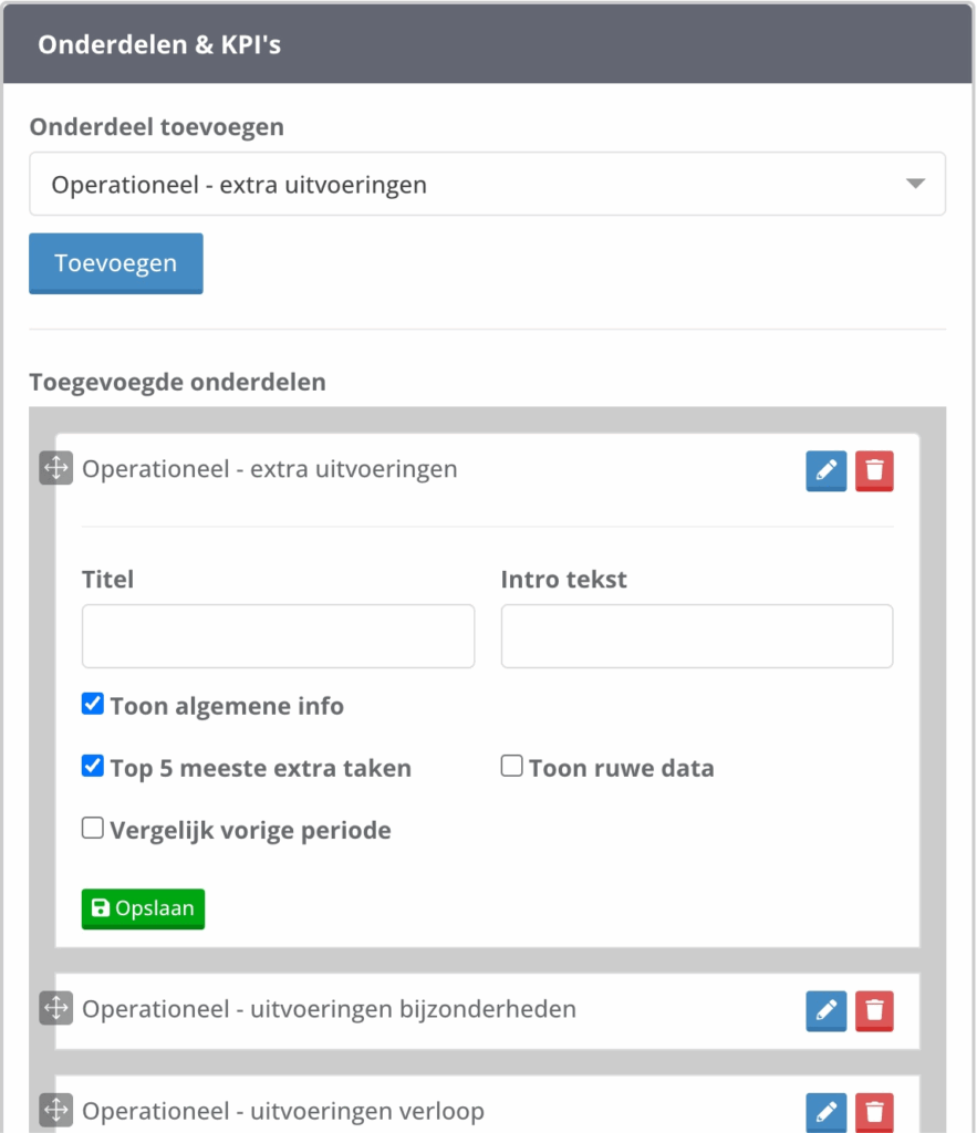 Vergeet niet op de groene knop “Opslaan” te klikken om de wijzigingen door te voeren. De taakonderdelen zijn daarna direct zichtbaar voor de uitvoerder in het rooster.