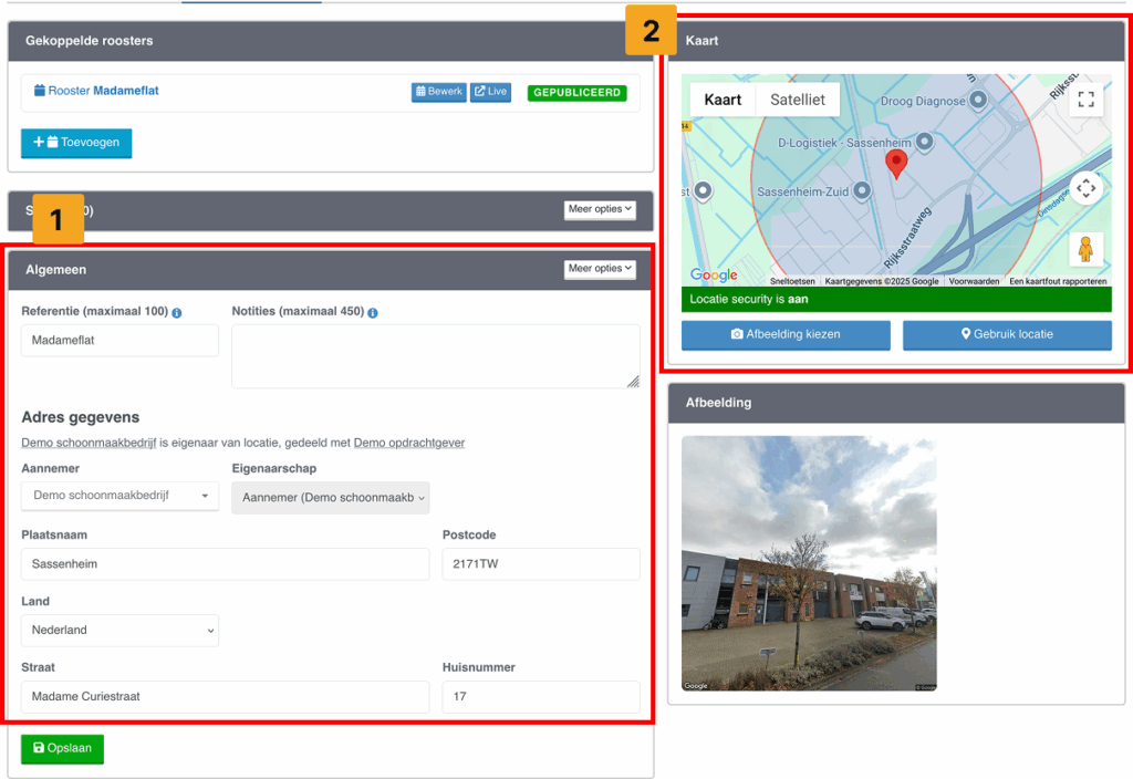 Let op: Zorg dat de pin-point nauwkeurig op het juiste adres staat en dat de afbeelding daadwerkelijk het gebouw toont. Zo voorkom je verwarring bij medewerkers en klanten.
