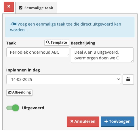 Zie hieronder een voorbeeld van een Taak + Beschrijving. Als je dag 'vandaag' kiest krijg je de optie om de taak direct af te tekenen via het schuifje 'Uitgevoerd'.