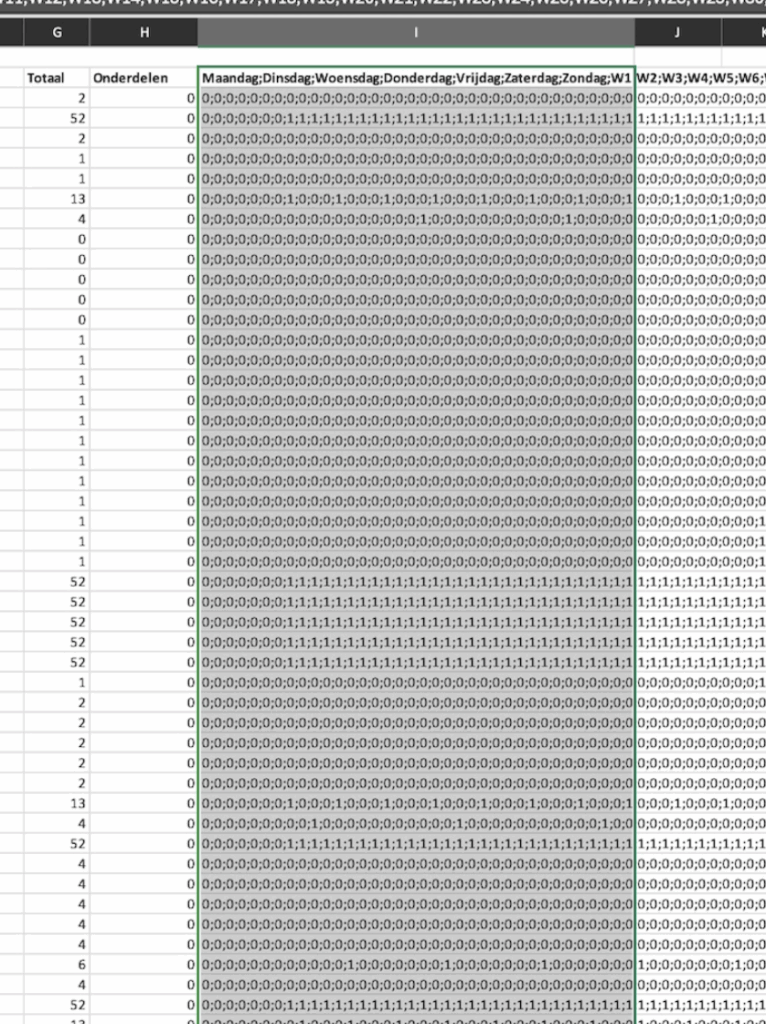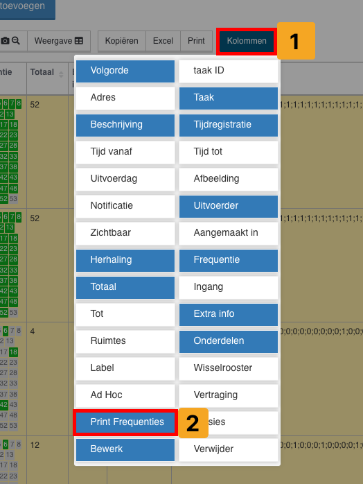 Selecteer de kolom 'Print Frequenties', dit zijn alle getallen, weeknummers, dagen etc.. die je allemaal rechts in je excel bestand ziet staan, hieronder een visual. (Klik op de afbeelding om te vergroten)