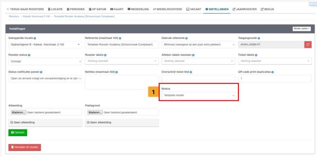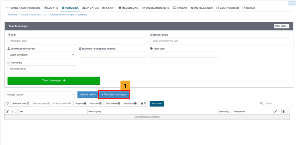 - Geef het rooster een duidelijke referentie naam, zodat je het later makkelijk herkent (Bijvoorbeeld: [Template rooster – Kantoor schoonmaak complex])