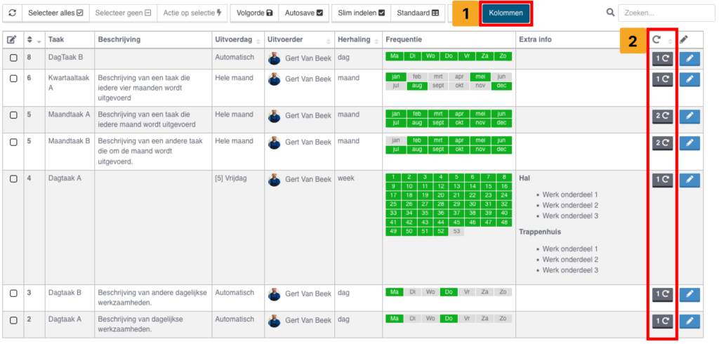 - In de tabel verschijnt nu een extra kolom met een versie-/revisie-icoon. Klik bij de juiste taak op dat icoon. (Zie 2 op afbeelding)