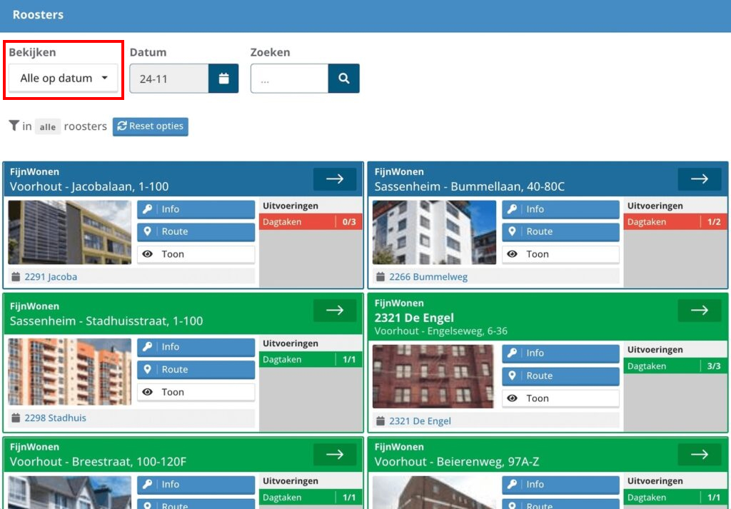 Kies "Alle op datum" of "Favorieten op datum" om te zien op welke locaties vandaag werkzaamheden staan gepland of al zijn uitgevoerd.