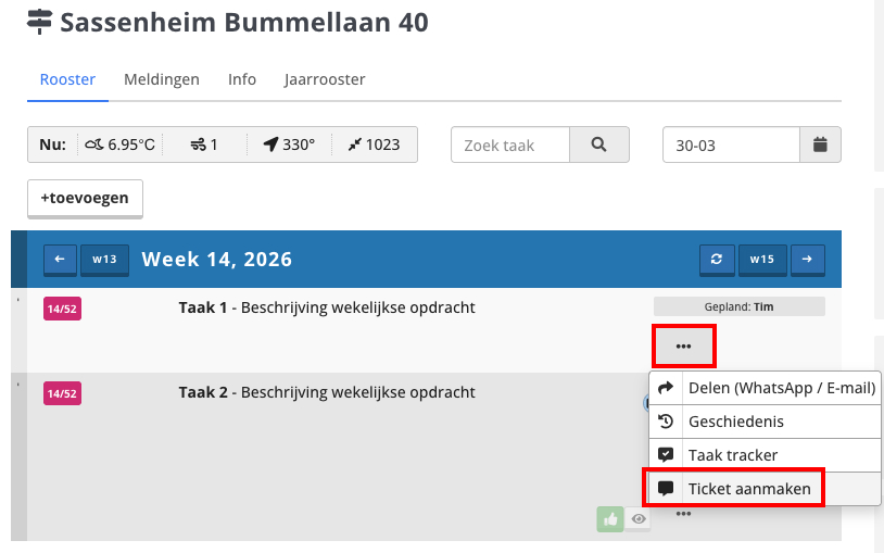 Ga naar de taak waarbij je een melding wilt maken en klik op de 3 bolletjes (naast de groene aftekenknop).